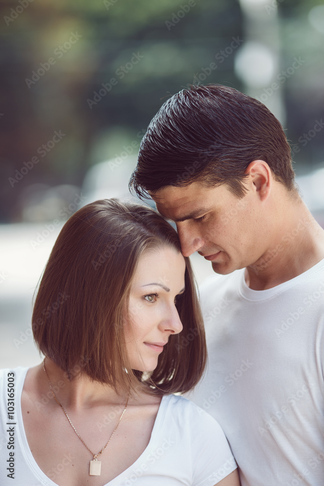 Closeup Portrait Of Beautiful Touching Romantic Couple Man Woman In Love On Spring Summer Day Outside Hugging Kissing Looking Away From Camera Toned With Instagram Filters Film Effect Movie Shot Stock Photo